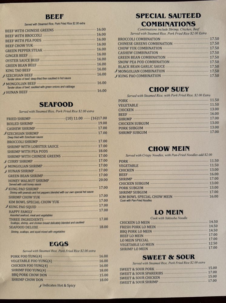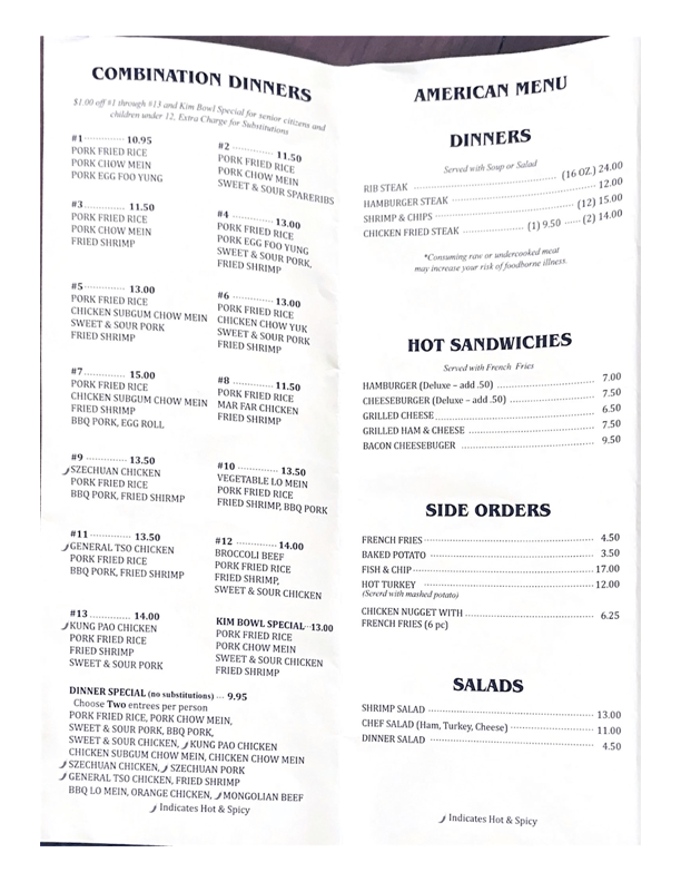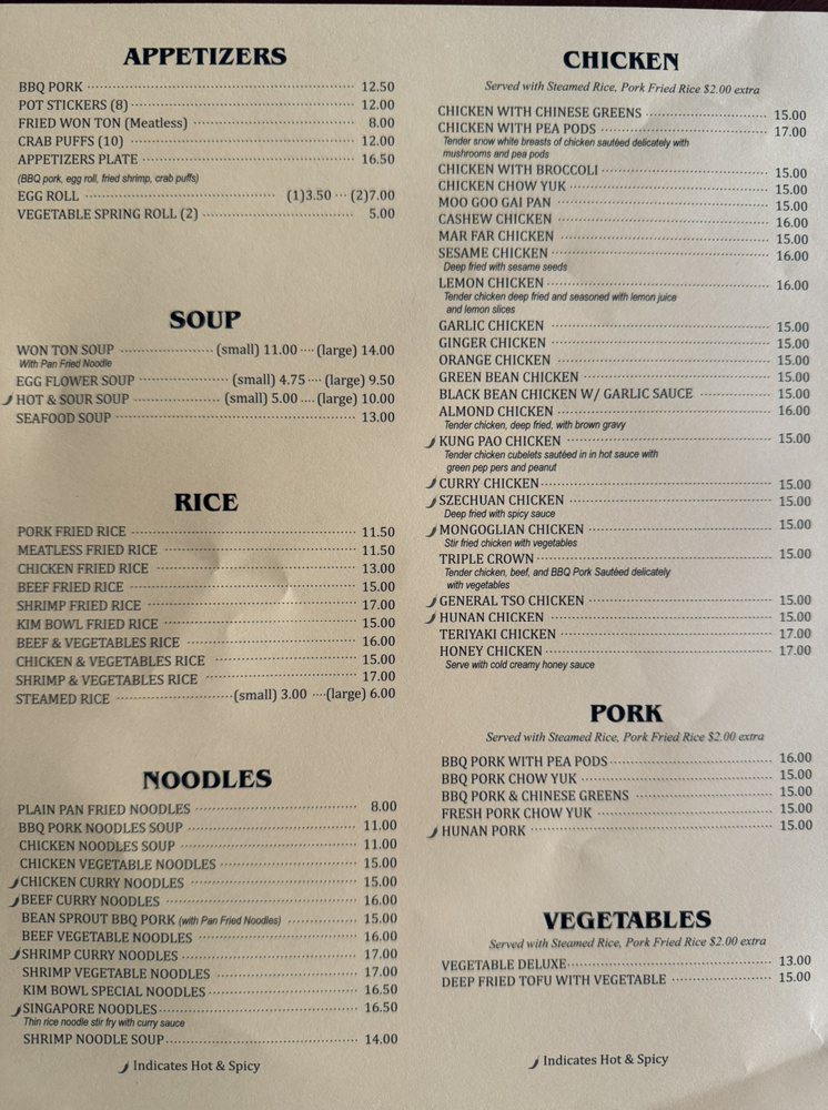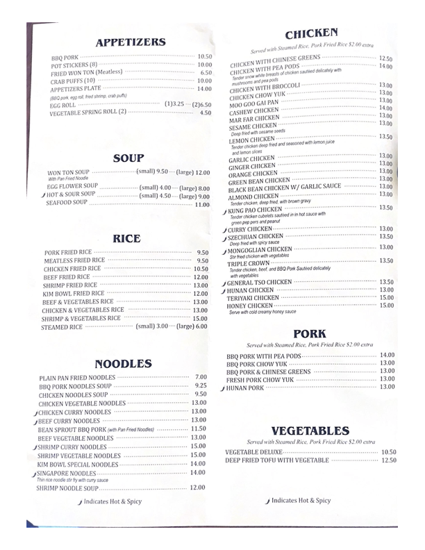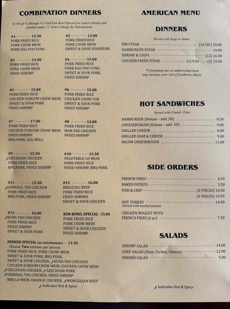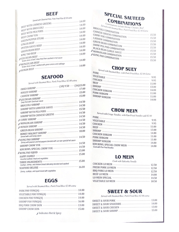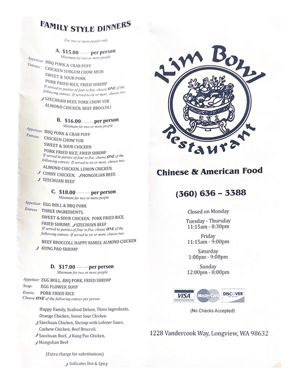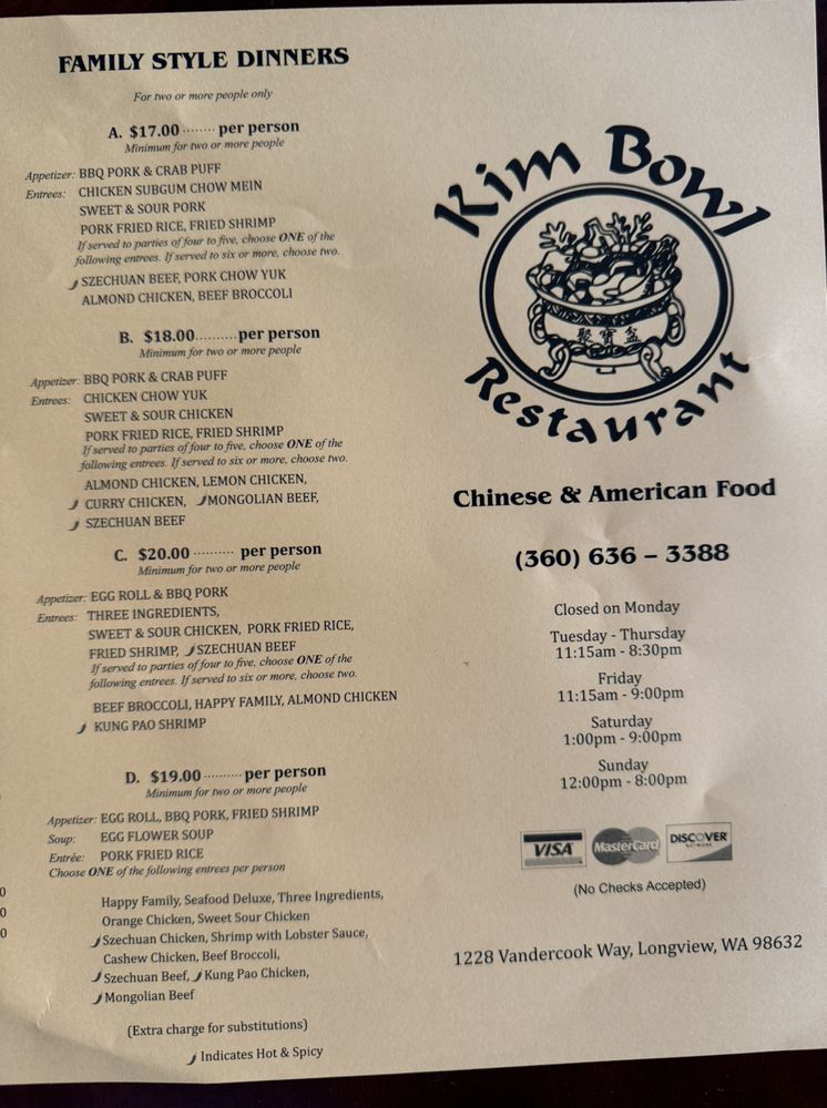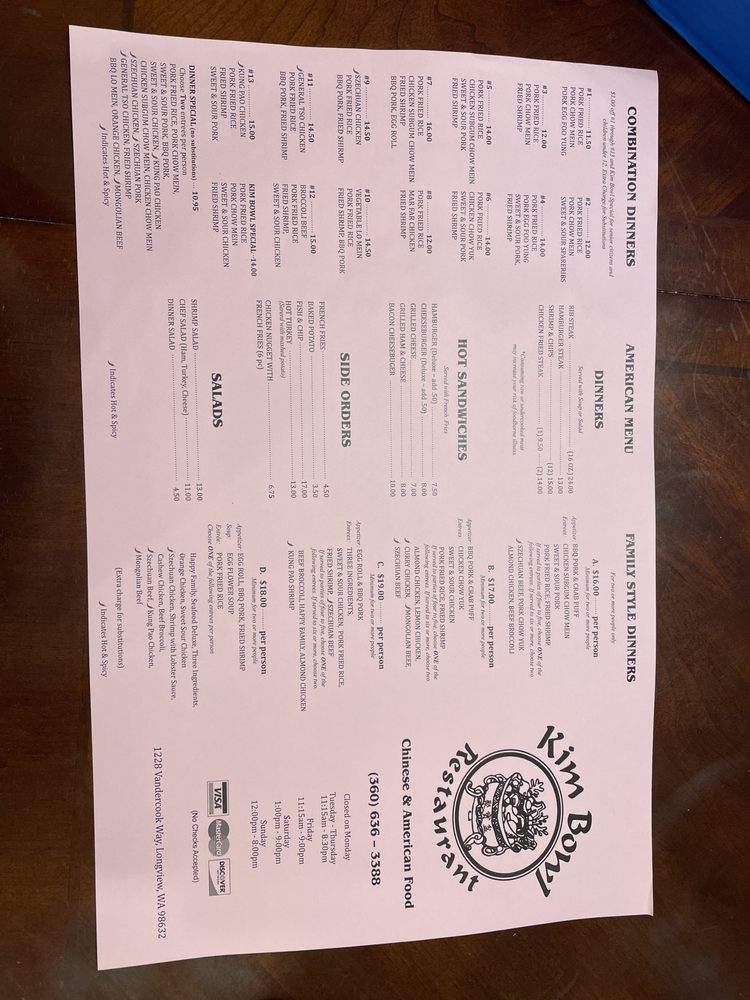 Kim Bowl Restaurant offers a unique blend of New American and Chinese cuisine, providing a diverse menu with many vegetarian options. Located in Longview, WA, the restaurant boasts a range of amenities including wheelchair accessibility, delivery, and even cryptocurrency payment options. Customers rave about the friendly service, generous portions, and fresh, flavorful dishes. From tasty tea to delectable entrees, Kim Bowl consistently delivers quality food at reasonable prices. The warm and welcoming atmosphere, combined with attentive staff, make it a favorite spot for families and friends alike. Whether you're a regular patron or visiting for the first time, Kim Bowl is sure to impress with its great service, delicious food, and affordable prices. This restaurant is a true gem in the local dining scene.